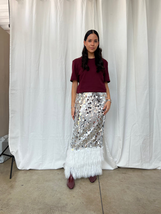 Falda maxi lentejuela con plumas