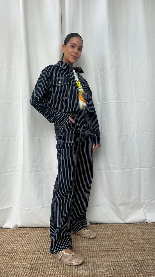 Chamarra denim a lineas azul y blanco