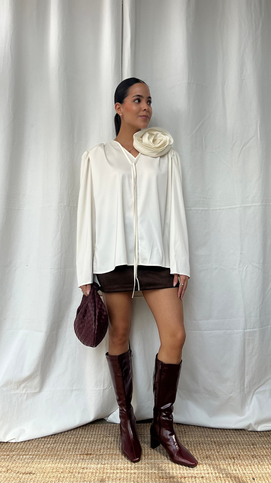 Blusa tipo satín con flor desmontable en marfil