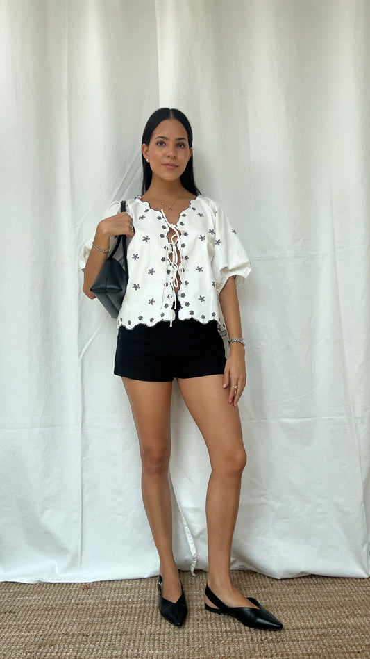 Blusa manga globo con amarres frontales en negra