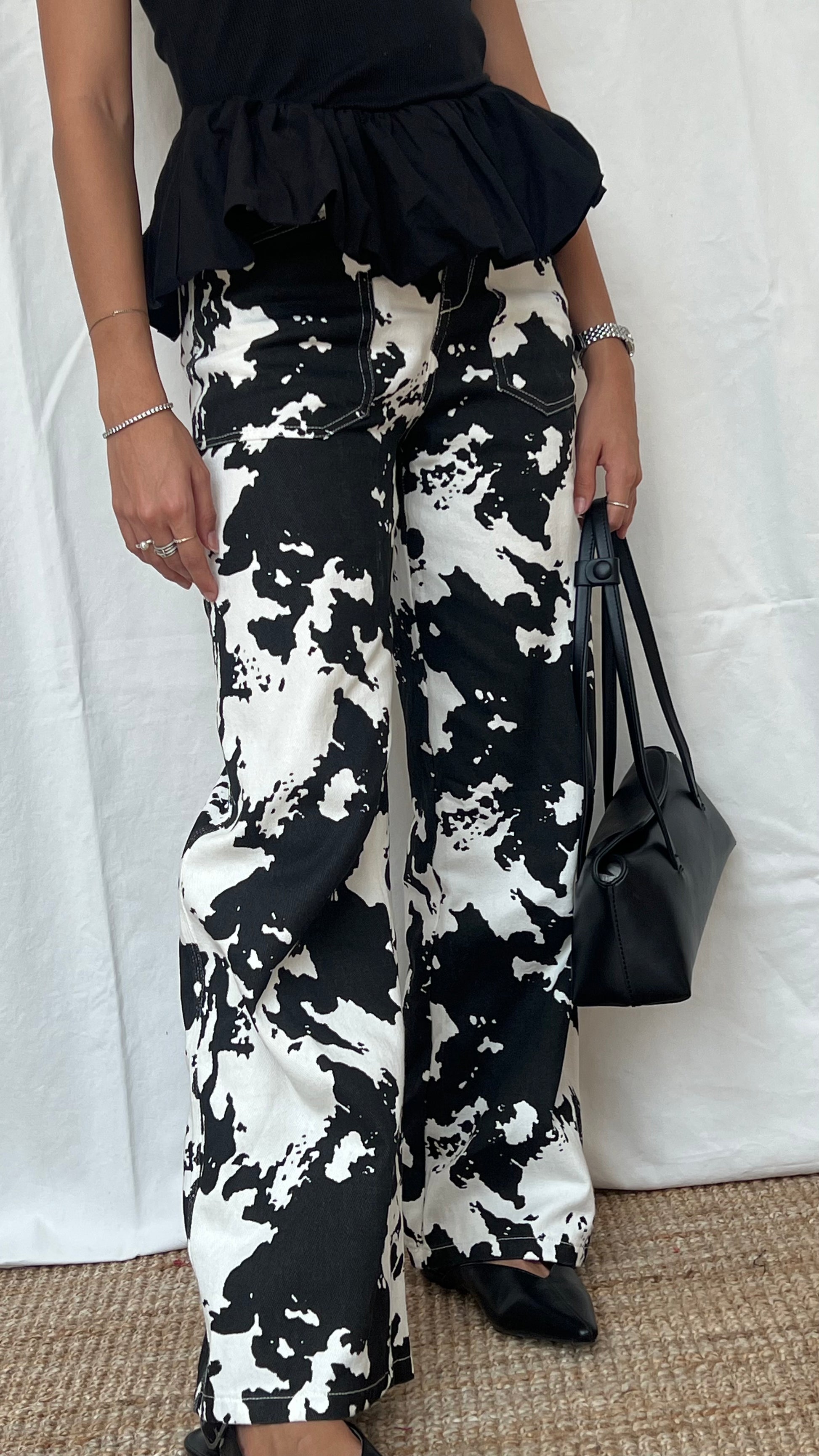 jeans con corte wide leg, con estampado en blanco y negro tipo cow print.