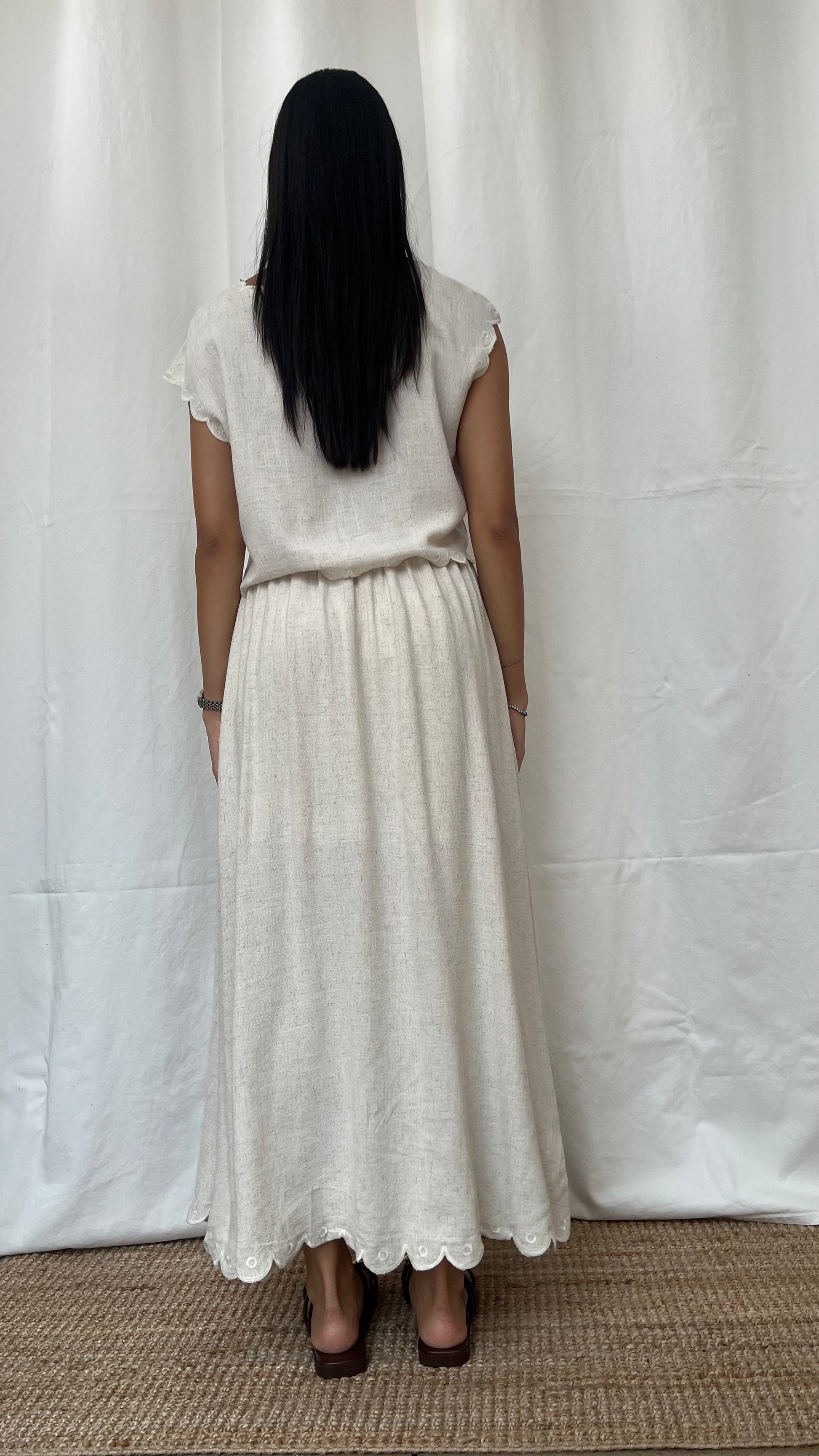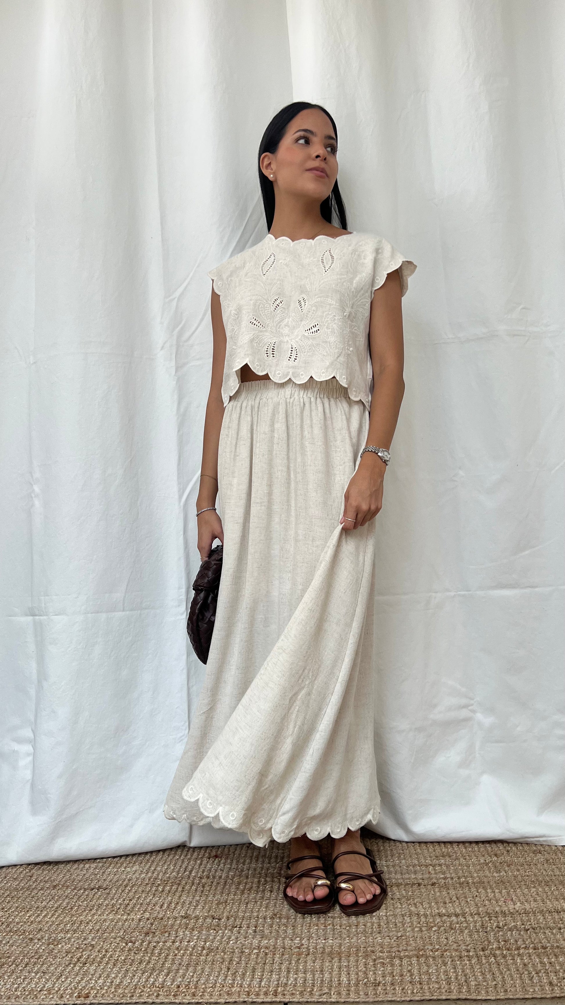 Set bohemio de blusa bordada y falda larga en lino crudo
